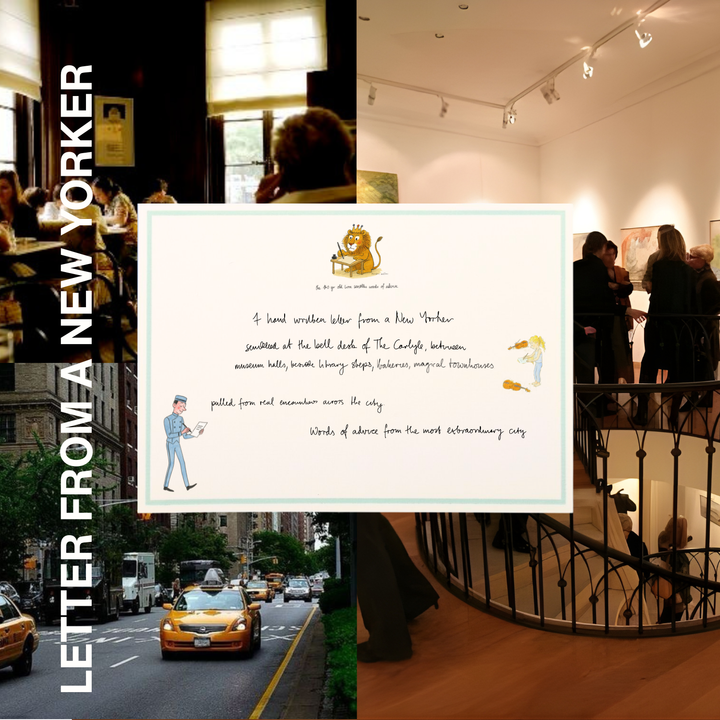Pre-Orders from 10/20 - 11/1 : Receive a hand written letter from a New Yorker. Scribbled at the bell desk of The Carlyle, between museum halls. Bakers, Train riders. Gallery assistants. Uniformed School children. After 11/1, included with orders over $150.